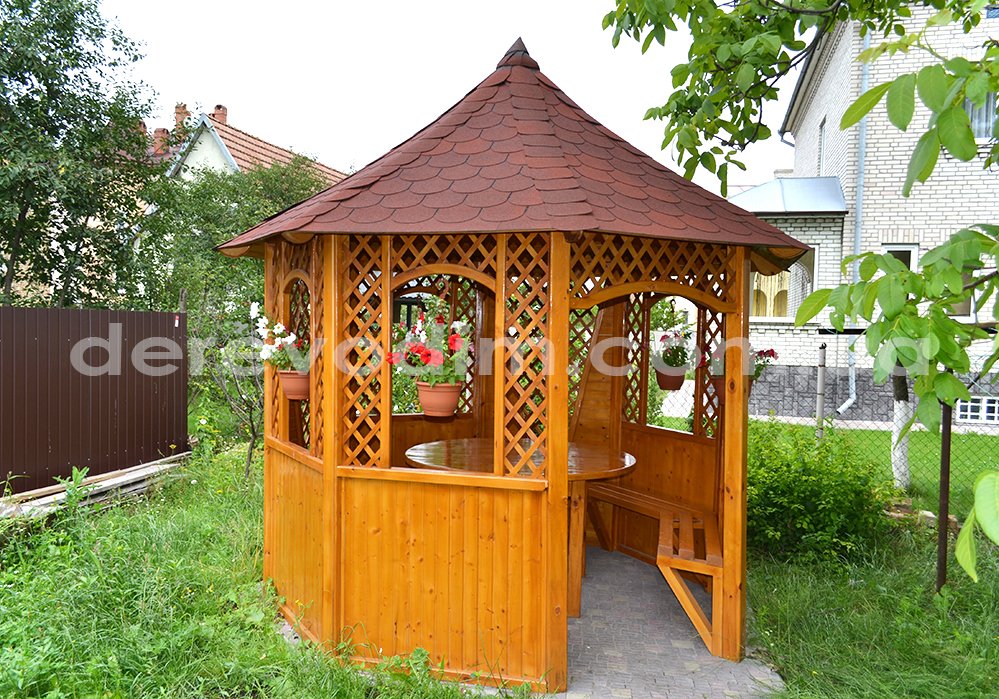 Шестикутна форма альтанки дозволяє заощадити простір без втрати місткості. Виглядає привабливіше і оригінальніше ніж звичайна прямокутна.