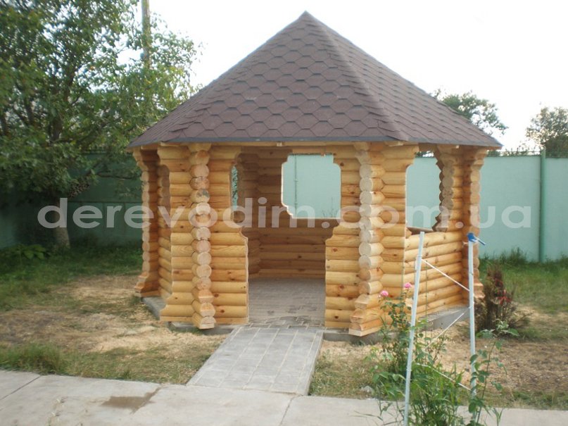 форма альтанки дозволяє заощадити простір без втрати місткості, виглядає привабливіше і оригінальніше ніж звичайна прямокутна