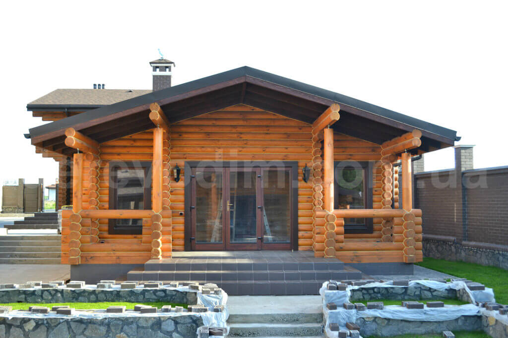 Альтанка споруджена з оциліндрованого бруса діаметром 200 мм. Вона оснащена просторою відкритою терасою та пічкою для барбекю.