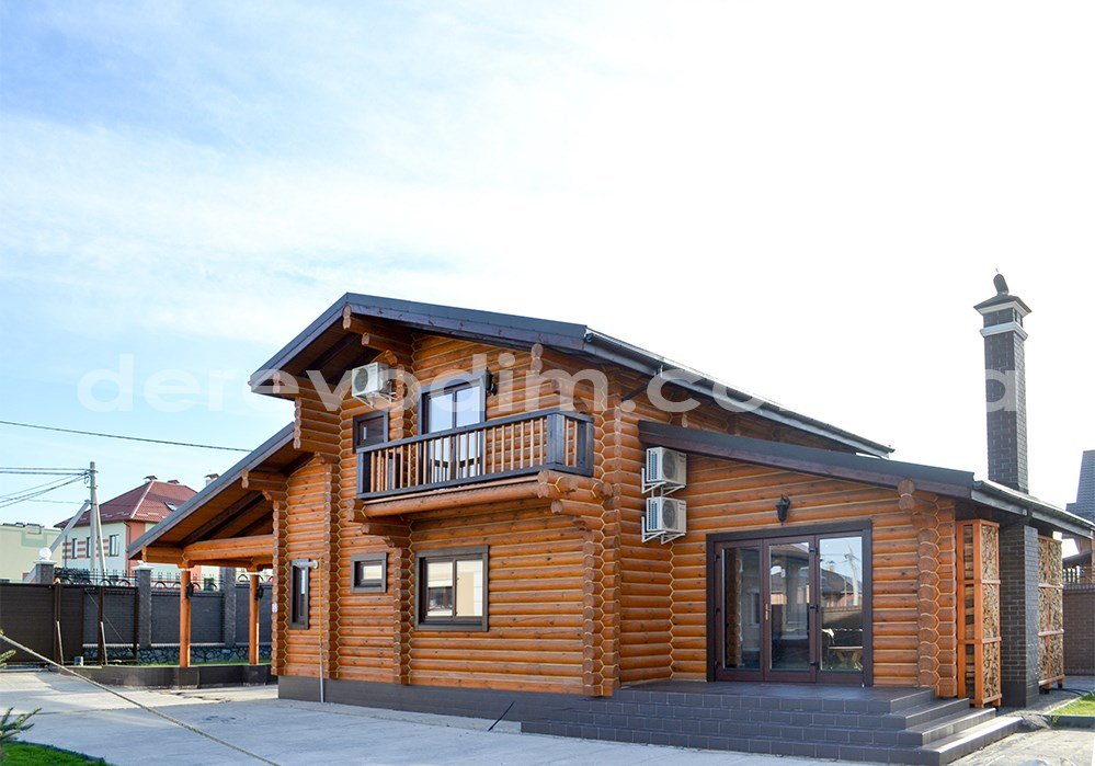 Центральним елементом усього комплексу з бруса є відпочинковий будинок. За рахунок дворівневого даху, дім має досить цікавий вигляд. Оригінальності споруді додають консолі, а також невеличкий балкон, де можна насолоджуватися чашечкою ароматної кави чи красою природи. Доповнює екстер’єр будинку дровітня, яка вдало поєднується зі стінами зрубу.