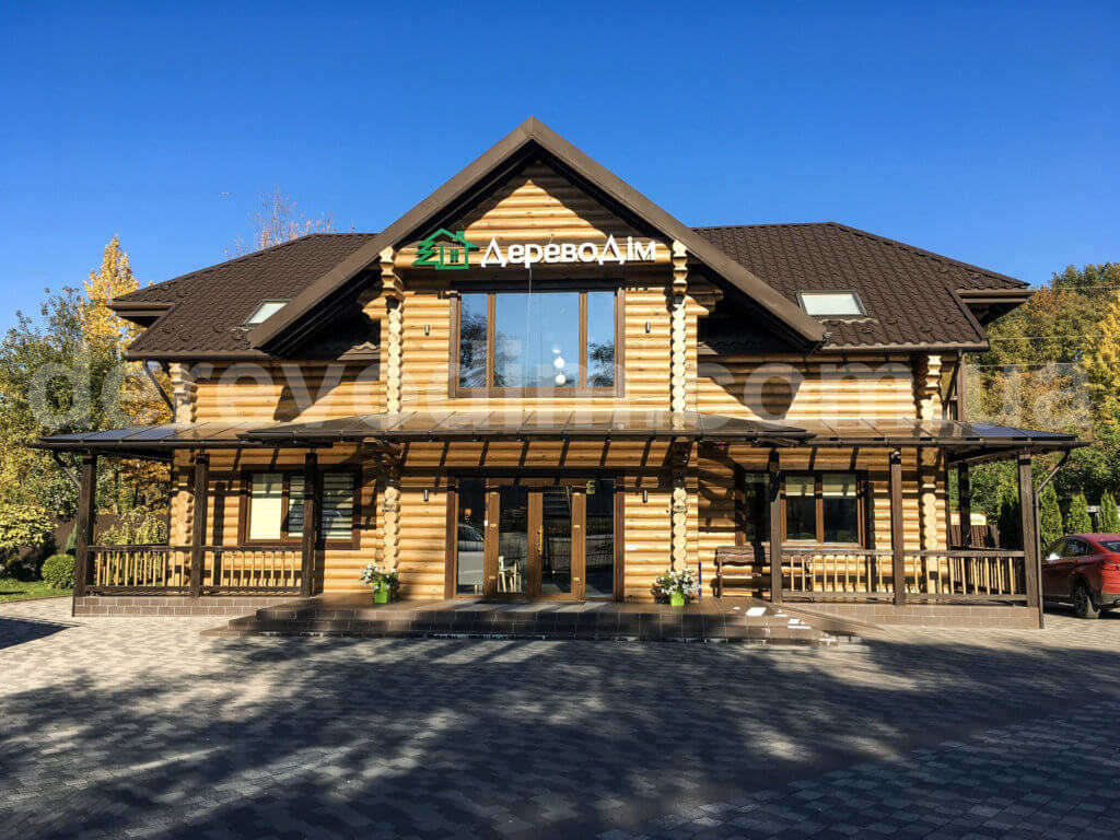 Родзинкою зовнішнього фасаду офісу, яка привертає увагу є тераса. Її особливістю є те, що для її покриття було використане гартоване скло. Тераса захищає лакофарбовані покриття від вигорання, а також робить офіс вишуканішим та презентабельнішим. Рекомендуємо Вам, будуючи дерев’яне житло, звертайте увагу на архітектурні вимоги щодо захисту його фасаду. Тоді ваша оселя зможе прослужити не одному поколінню.
