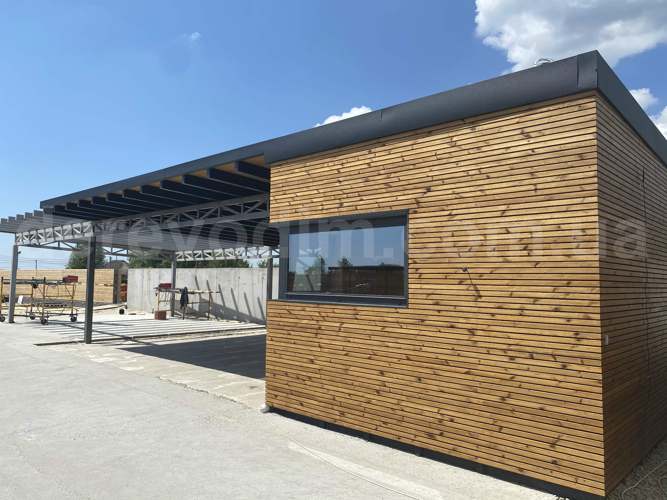 сторожовий будиночок виконано в фінському стилі, не займає багато місця, плоский дах