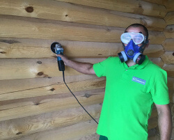 Проводят его шлифовальными машинками с различными насадками. Шлифовка стен снаружи и внутри осуществляется по одному алгоритму. В процессе работы наши специалисты используют респиратор, ведь в воздухе очень много древесной пыли.