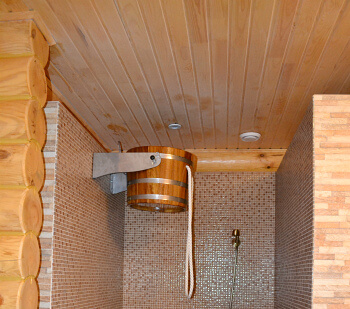 - Обливной вид купели. Этот вариант конструкции встраивается в стену или потолок помещения, на уровне - выше человеческого роста. С помощью веревки человек может вылить на себя воду из емкости, которая переворачивается, а потом возвращается в исходное положение. Как правило, вода в такую купель наполняется автоматически. Мощный поток холодной воды мгновенно обольет и подарит заряд энергии. Этот вид довольно прост в установке и имеет небольшие размеры. При этом, не требует использования дорогостоящих материалов. Традиционно, «ведро-водопад» изготавливается из натурального дерева. Такой вариант идеально подойдет для небольших сооружений. «Ведро-водопад» делает процедуру обливания легкой и веселой. Вместе с тем, прекрасно дополнит интерьер бани из сруба. Денежные затраты на устройство такого типа купели минимальны. Да и времени на ее установку тратится довольно не много.
