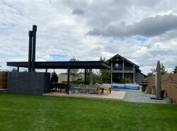 Вторым объектом во дворе нашего заказчика - стала беседка-навес. Она защитит от ветра, дождя и солнца, что в свою очередь значительно расширяет возможности использования конструкции.