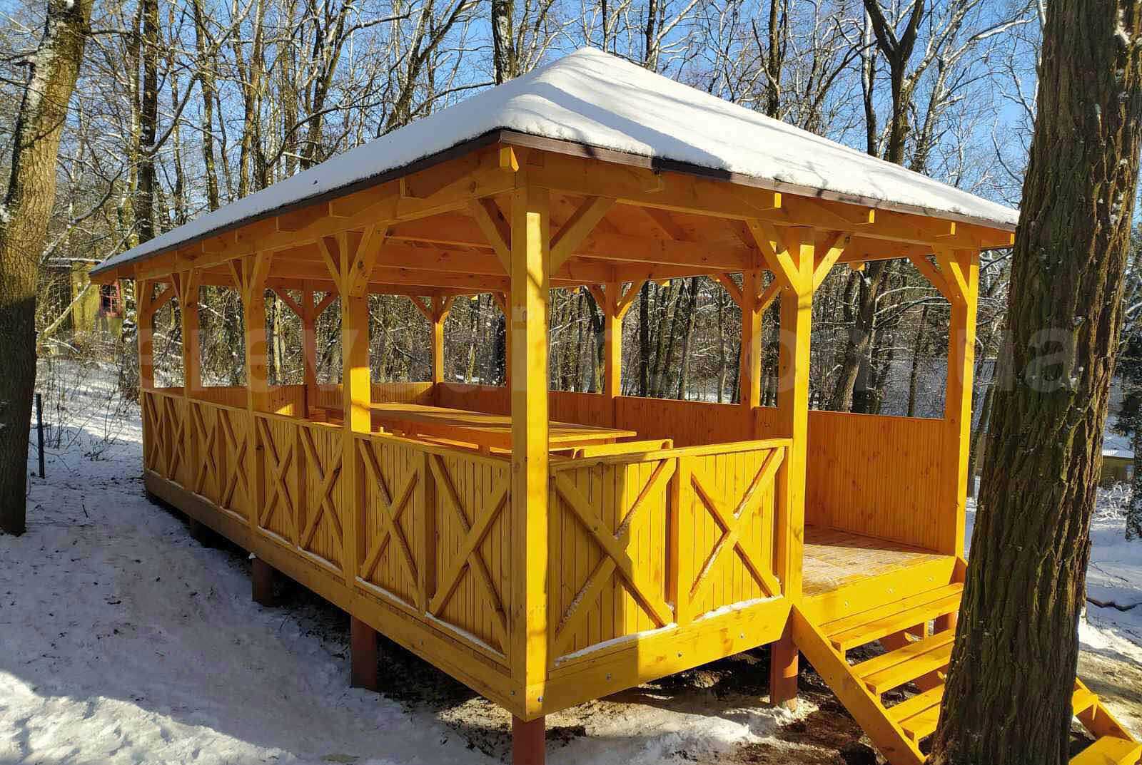 Конструктивно, беседка является строением прямоугольной формы, площадью 32 м2. Такое сооружение может вместить до 10 человек.