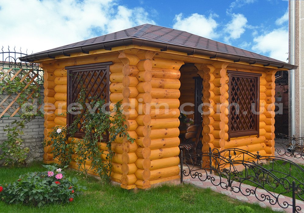 Четырехугольная беседка из дерева гармонично сочетает в себе массивный деревянный брус и ажурные деревянные решетки.
