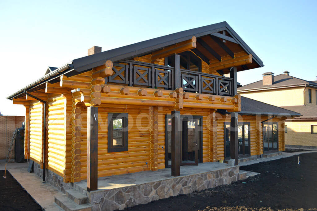 балконные перила из бруса квадратного сечения, темная крыша, колонны