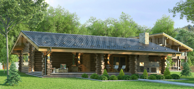 Это стильный проект деревянного дома, выполненный из оцилиндрованного бруса, который на одном этаже вмещает максимальное количество функциональных помещений.