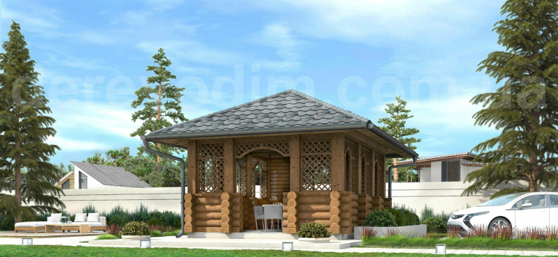 Проект классической беседки 3-4 из цельного оцилиндрованного бревна – достаточно простой и уютный.